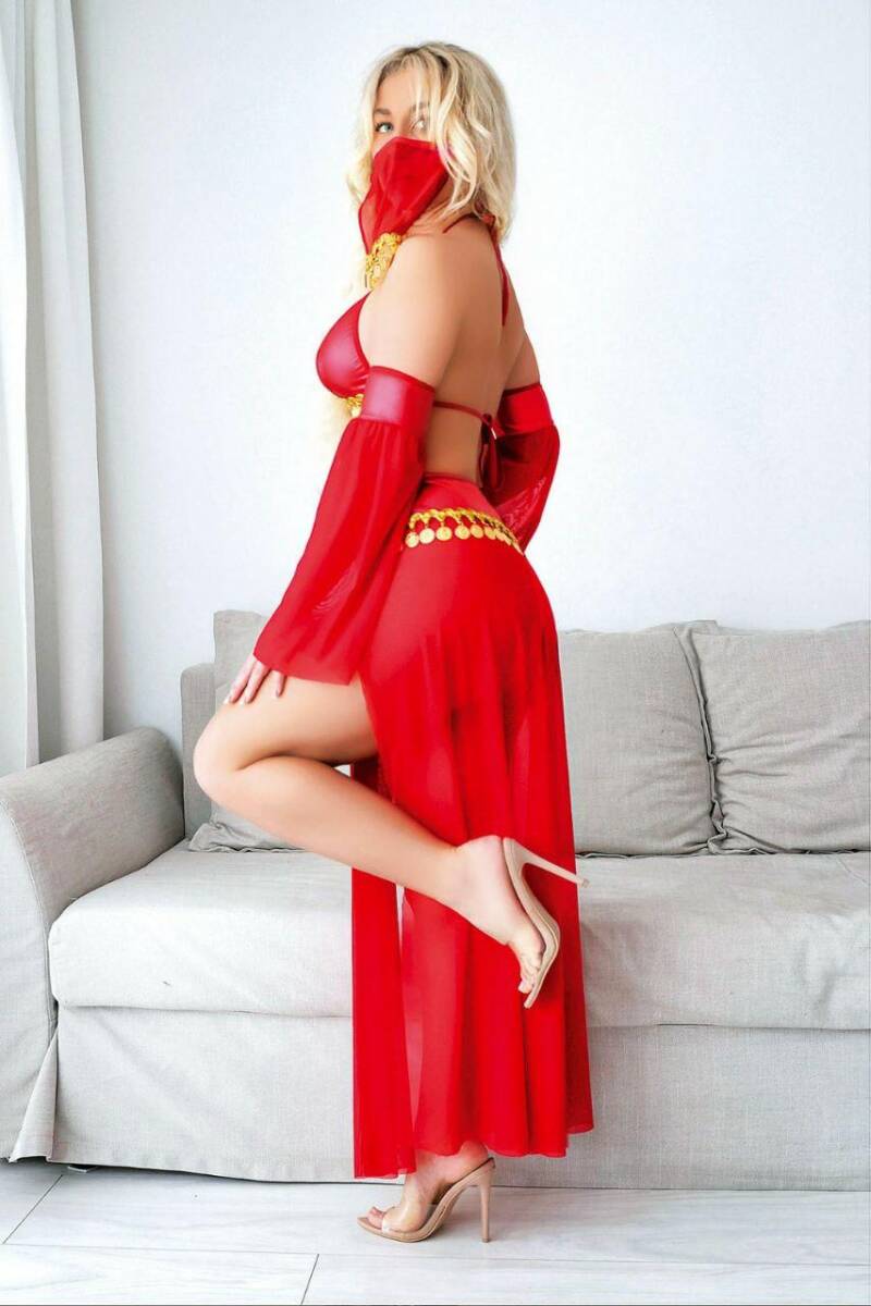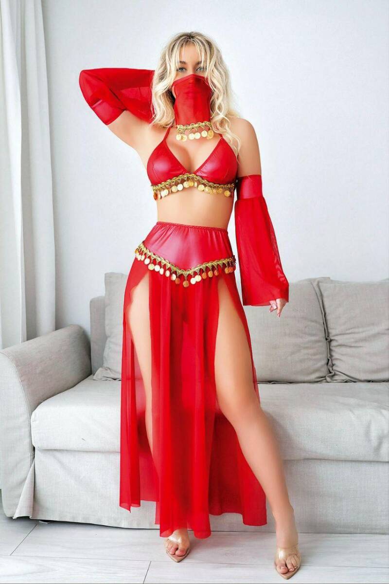 Renkli dansöz kostümü, canlı ve göz alıcı renkleriyle dikkat çeker, sahne performanslarında veya özel günlerde dikkat çekici bir görünüm sağlar.