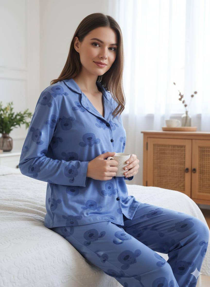 S-M-L-XL beden seçenekleriyle her vücut tipine uyum sağlar. Koala baskısı, pijama takımına eğlenceli bir karakter kazandırırken, pastel mavi tonlarıyla huzurlu bir atmosfer yaratır.