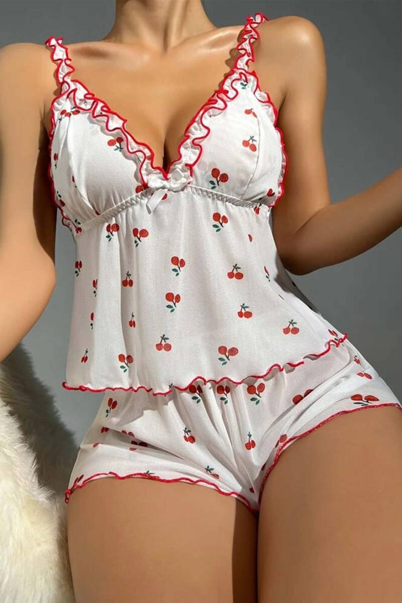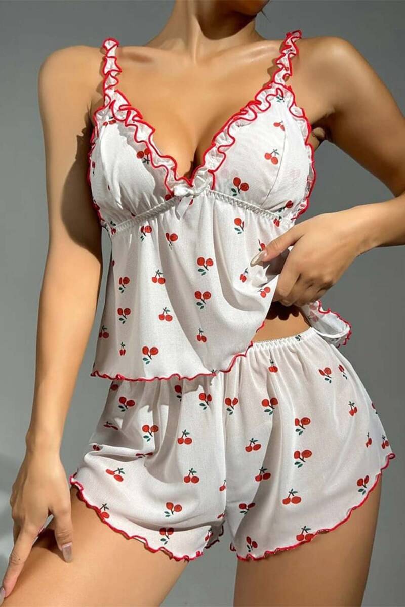 Frill kiraz desenli özel tasarım şortlu takım 6277