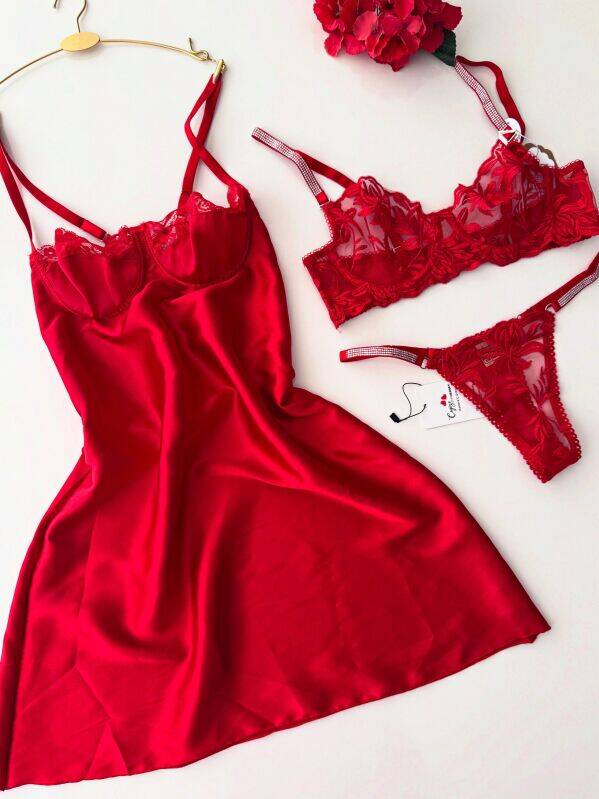 Zarafeti ve çekiciliği bir arada sunan kırmızı saten dantel gecelik takımı, özel günlerinizde kendinizi muhteşem hissetmeniz için tasarlandı.