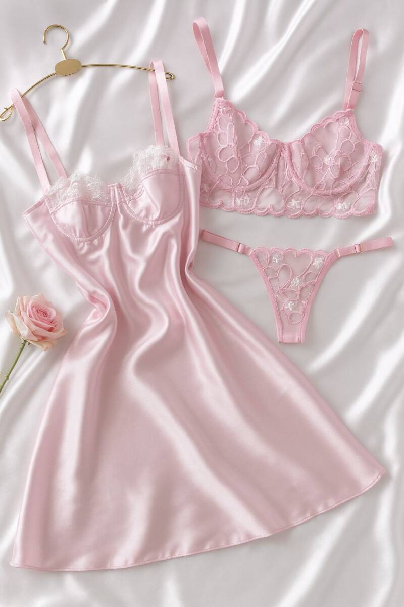 Luna Charm Pink Saten Gecelik 3 Parça Gecelik ve Bralet seti 6953