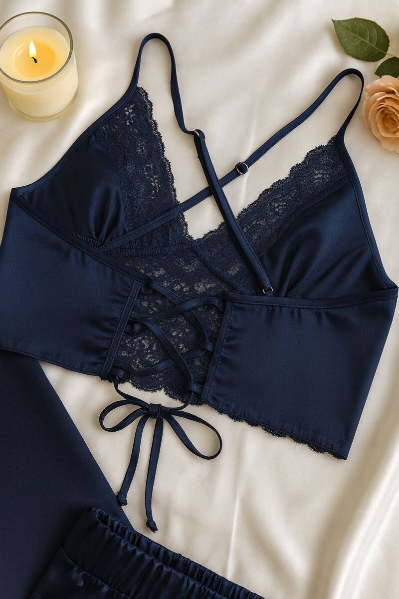 ✨ İster özel bir geceye hazırlık, ister çeyizinizin en zarif parçası… Midnight Glow Şık lacivert Saten Dantel Pijama