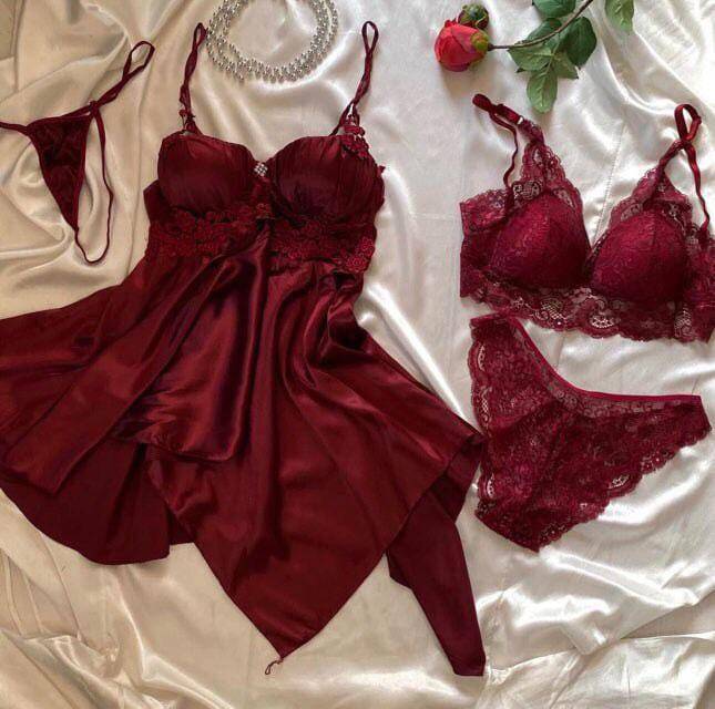 Zarafeti ve tutkuyu bir araya getiren iç Giyim Seti, kendinizi özel hissetmeniz için tasarlandı. Bu 4 parçalık şık set; dantel detaylı saten gecelik, uyumlu tanga, dantel sütyen ve külot içerir. Derin bordo tonuyla her cilt tonuna uyum sağlar ve sofistike bir görünüm sunar.