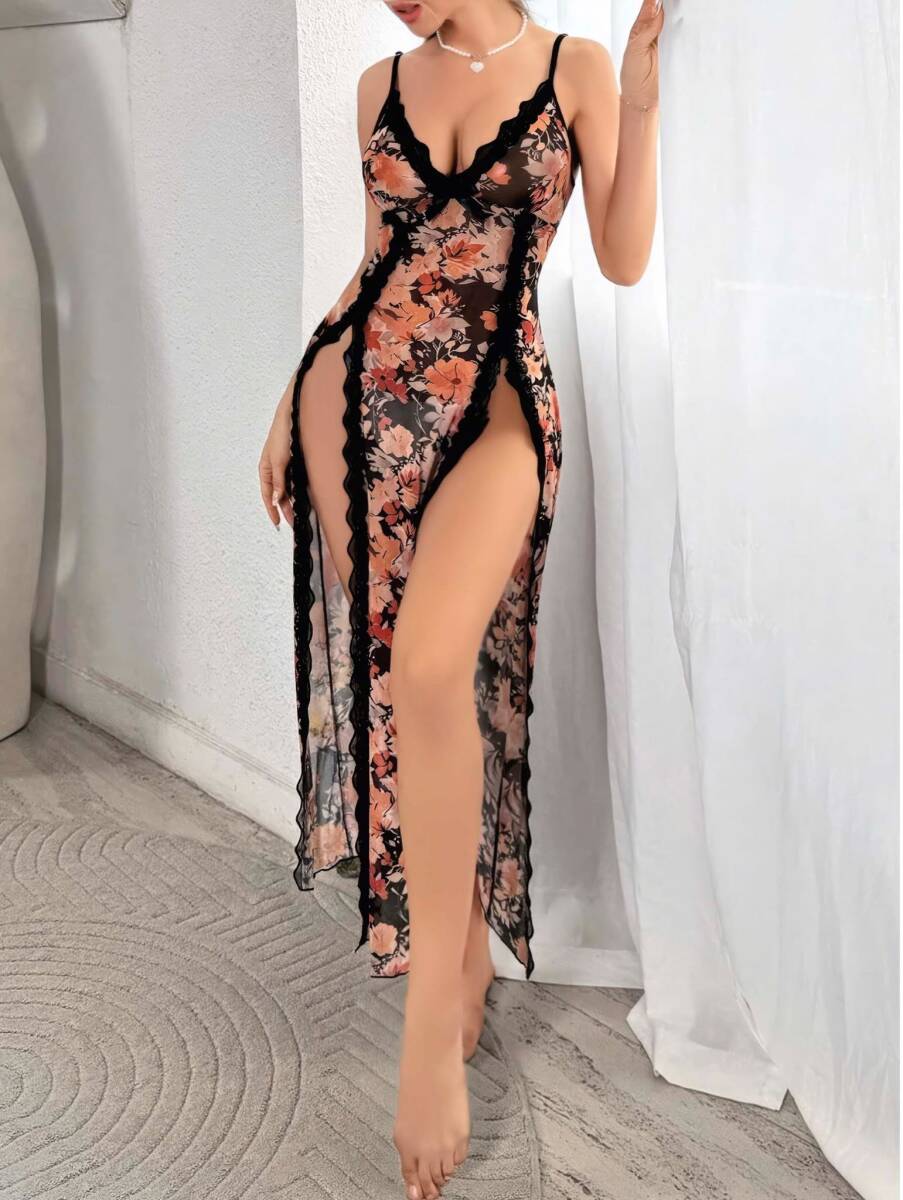 Çiçek desenli, üretilmiş şık ve cesur bir iki parça gecelik takımı.