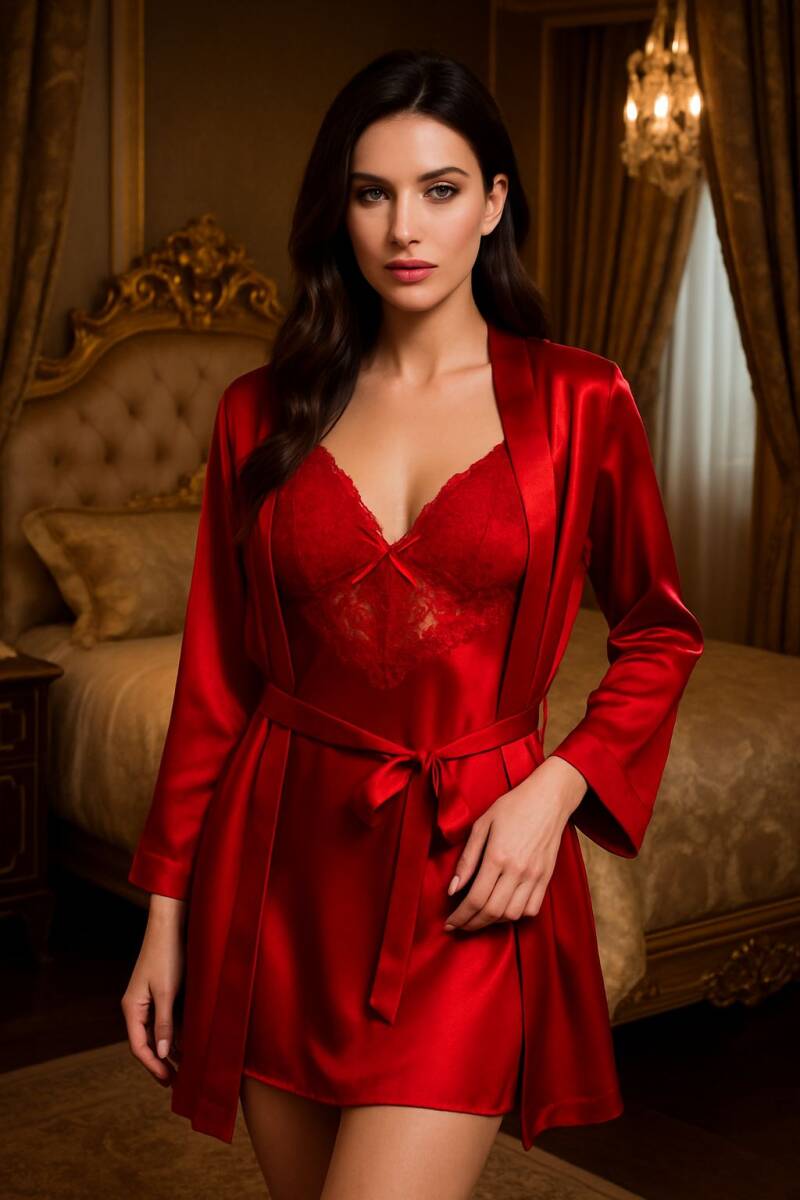 • İnce ayarlanabilir askılar • Göğüs kısmında zarif dantel detay kaplıdır • Kuşaklı sabahlık dahil iki parçadan oluşur • “Cool & chic” ev şıklığı için mükemmel tercih saten gecelik • gecelik sabahlık takımı • kırmızı saten gecelik • dantel gecelik • kadın gecelik seti • sabahlıklı gecelik • iç giyim gecelik