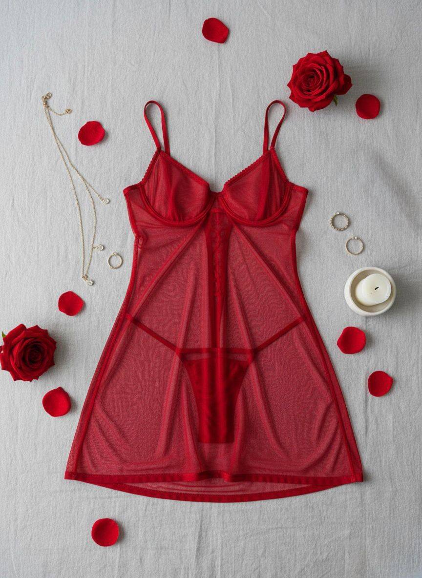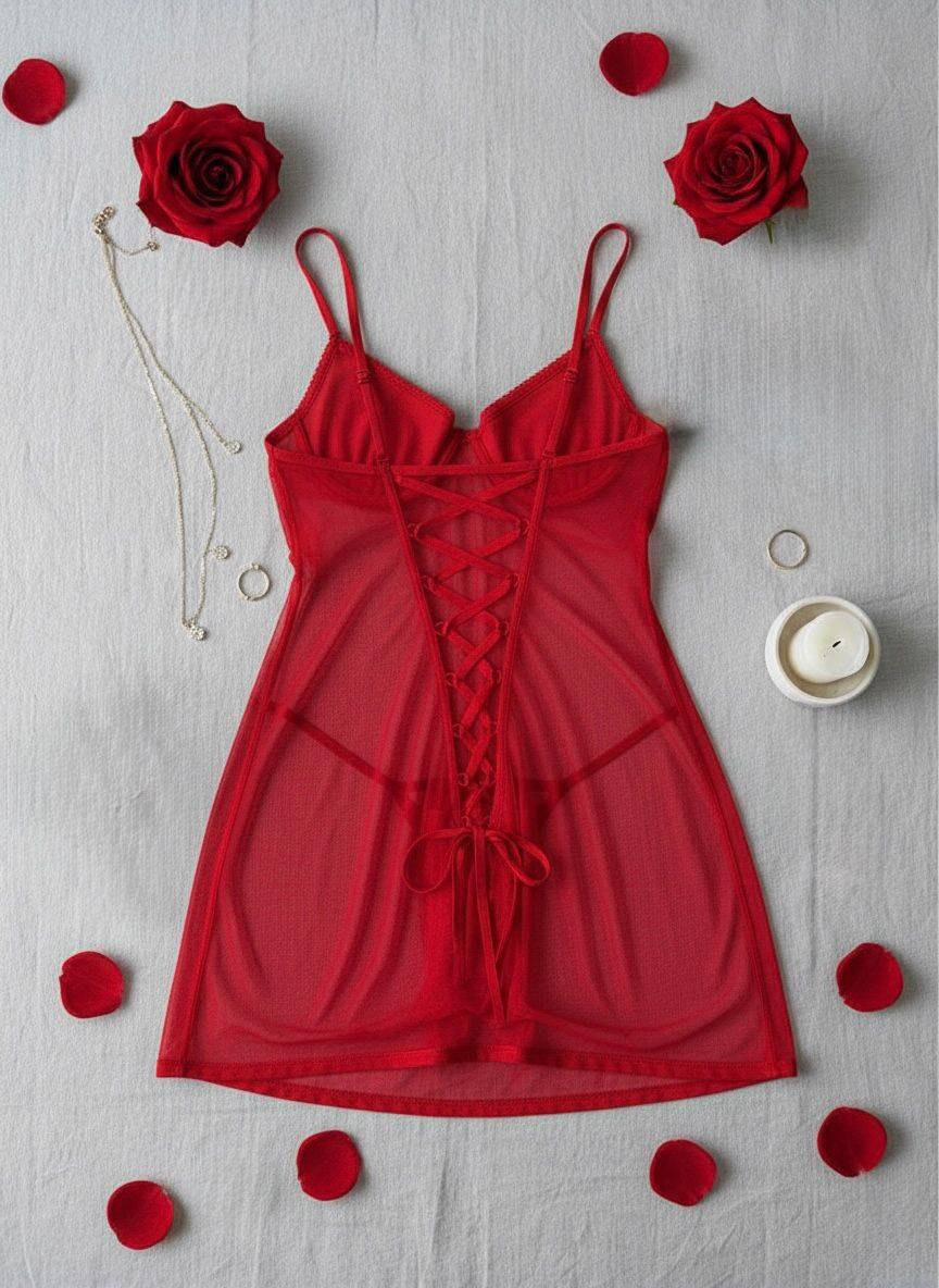 Yumuşak ve hafif tül kumaşı sayesinde cilde nazikçe oturur, ince askılı tasarımı ile feminen bir görünüm sunar. Arka kısmındaki çapraz bağlama detayı vücut hatlarını ön plana çıkarırken ayarlanabilir yapısıyla kusursuz bir uyum sağlar. kadın gecelik, kırmızı gecelik, transparan gecelik, tül gecelik, fantazi gecelik, seksi gecelik, arka çaprazlı gecelik, bağlamalı gecelik, ince askılı gecelik, balayı geceliği, romantik gecelik, iç giyim kadın, şeffaf gecelik, dantelli gecelik
